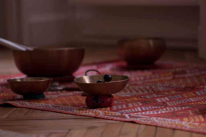 In der Klang- Massage wird mit Klangschalen unterschiedlicher Größe, aber auch mit Gongs und Zimbeln gearbeitet