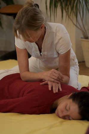 Im Shiatsu wird mit Fingern, Händen, Ellbögen, Knien, Füssen entlang den Meridianen oder an einzelnen Punkten (Tsubos) sanfter Druck ausgeübt.
